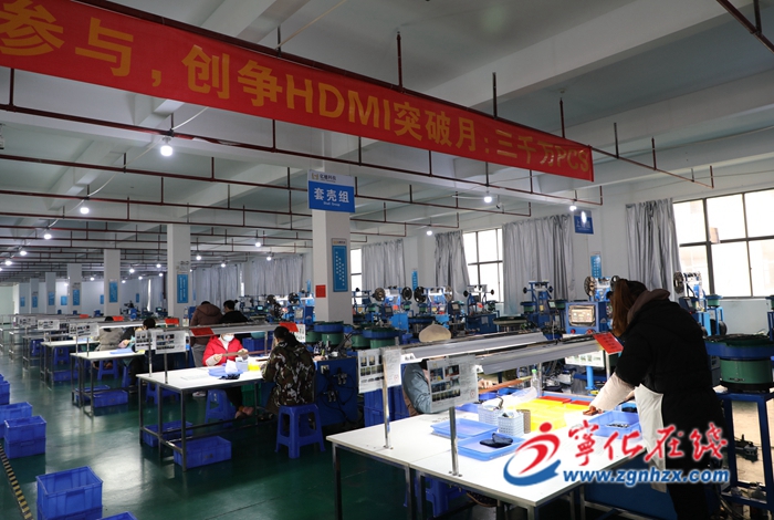 插端、套殼、上錫、包裝……工人各司其職,忙而不亂。該公司于2020年底投產(chǎn),總投資1.2億元,現(xiàn)已投資3000萬元,建設(shè)年產(chǎn)2億個(gè)HDMI高清音視頻連接器生產(chǎn)線,產(chǎn)品主要用于平板電腦、顯示器、機(jī)頂盒等,產(chǎn)品嚴(yán)格按照ISO9000、ISO14000標(biāo)準(zhǔn)生產(chǎn),符合ROHS、RACH、SONY標(biāo)準(zhǔn),客戶群終端有華為、中興、富士康等品牌。2021年,該公司生產(chǎn)近2億個(gè)HDMI高清音視頻連接器,產(chǎn)值2300多萬元。
