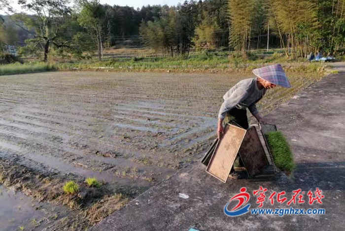連日來,在寧化縣方田鄉(xiāng)水稻專業(yè)合作社的稻田里,有的農(nóng)戶駕著水稻插秧機(jī)在平整好的田里往返穿梭,一株株嫩綠的古坑米粉專用稻秧苗被整齊有序地插入田中;有的則忙著搬運(yùn)秧盤、清理溝渠等,呈現(xiàn)一派繁忙景象。