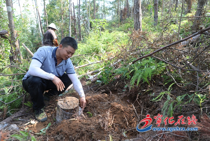8月17日,寧化縣中沙鄉練畬村埔上組后山上,30多名村民正在擇伐后的松樹蔸樁上,放置一袋袋茯苓菌包。
