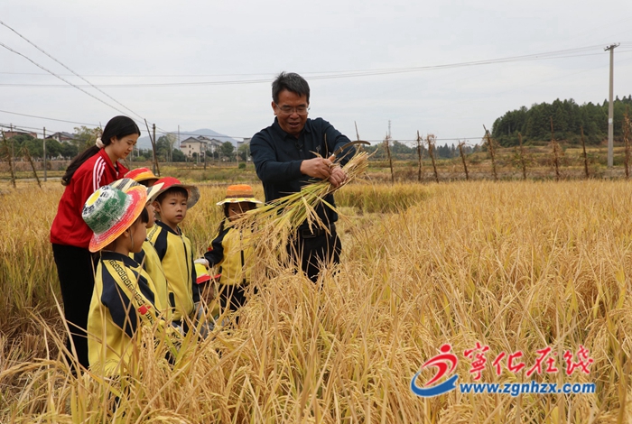 河龍鄉黨員委員、正高級農藝師曾仁杰帶孩子們參觀了貢米文化廣場和貢米小院,向孩子們講解了貢米的歷史及有關農耕文化的知識,并指導孩子們收割水稻。在老師和家長的帶領下,萌娃們紛紛走向河龍貢米基地,變身“小稻農”,體驗秋收的喜悅與艱辛,感受糧食的來之不易。?