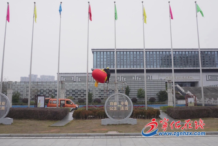 在世界客屬文化交流中心,工人們正在利用鋼絲懸掛固定直徑為2米的鐵口綢布大紅燈籠,燈籠鮮紅的外觀給廣場添上了喜慶的氛圍。