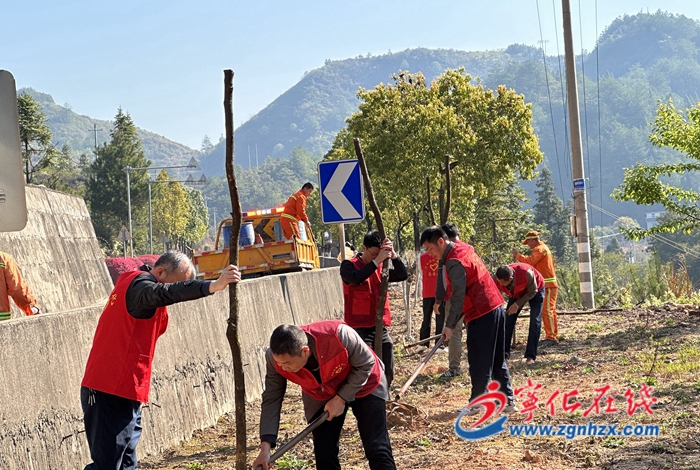 志愿者們相互協作,或搬運樹苗、或擴穴培土、或澆水灌溉,在省界公路兩旁新植香樟50余棵,與原有的香樟、福建山櫻花、紅花繼木球、紫薇串珠成鏈,接點連線,打造“上喬中灌下花草”的道路景觀,提升了省界公路綠化品質。