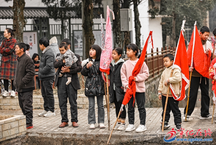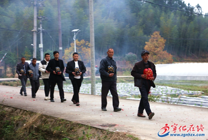 上午九時許,“儺神”面具裝扮完成,七位儺神依次手舞足蹈地從吳氏祖堂大門跳出來,各手持一枝“祈福鞭”左右揮動,群眾們紛紛向“儺神”作揖,祈求竹帚子鞭打自己和懷抱里的小孩,以驅邪保平安,開啟新年。隨后,游儺隊伍由牌子鑼鼓開道,七位“儺神”排成一字縱隊,走在“游儺”隊伍的中間,眾多孩童組成隊伍手擎彩旗緊隨其后,開始沿著村子巡游,村民紛紛燃放鞭炮焰火,向儺神作揖祈福。