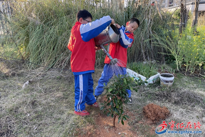 活動中,少先隊員們在黨員志愿者的帶領下,手持工具,精心呵護樹苗,為樹木松土、修剪和澆水,將新種植樹苗打理得井井有條,志愿者還為每株樹苗掛上自己的種植標簽。