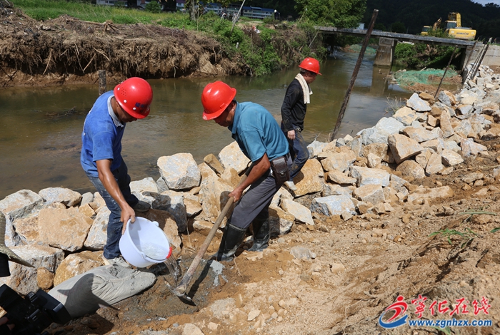 8月2日,在安遠鎮寧溪山洪溝防洪治理工程施工現場,挖掘機開足馬力,清理河床內淤積的泥沙,工人嚴格按照技術標準,進行河堤和護岸的砌筑作業。