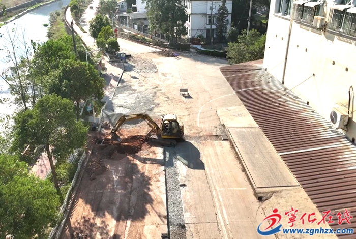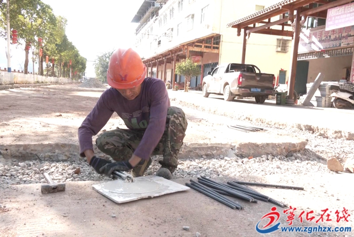 在水茜鎮(zhèn)集鎮(zhèn)道路修建項目現(xiàn)場,工人們正在進行路邊欄桿、路沿石抬高、破損路面拆除恢復等工作。?