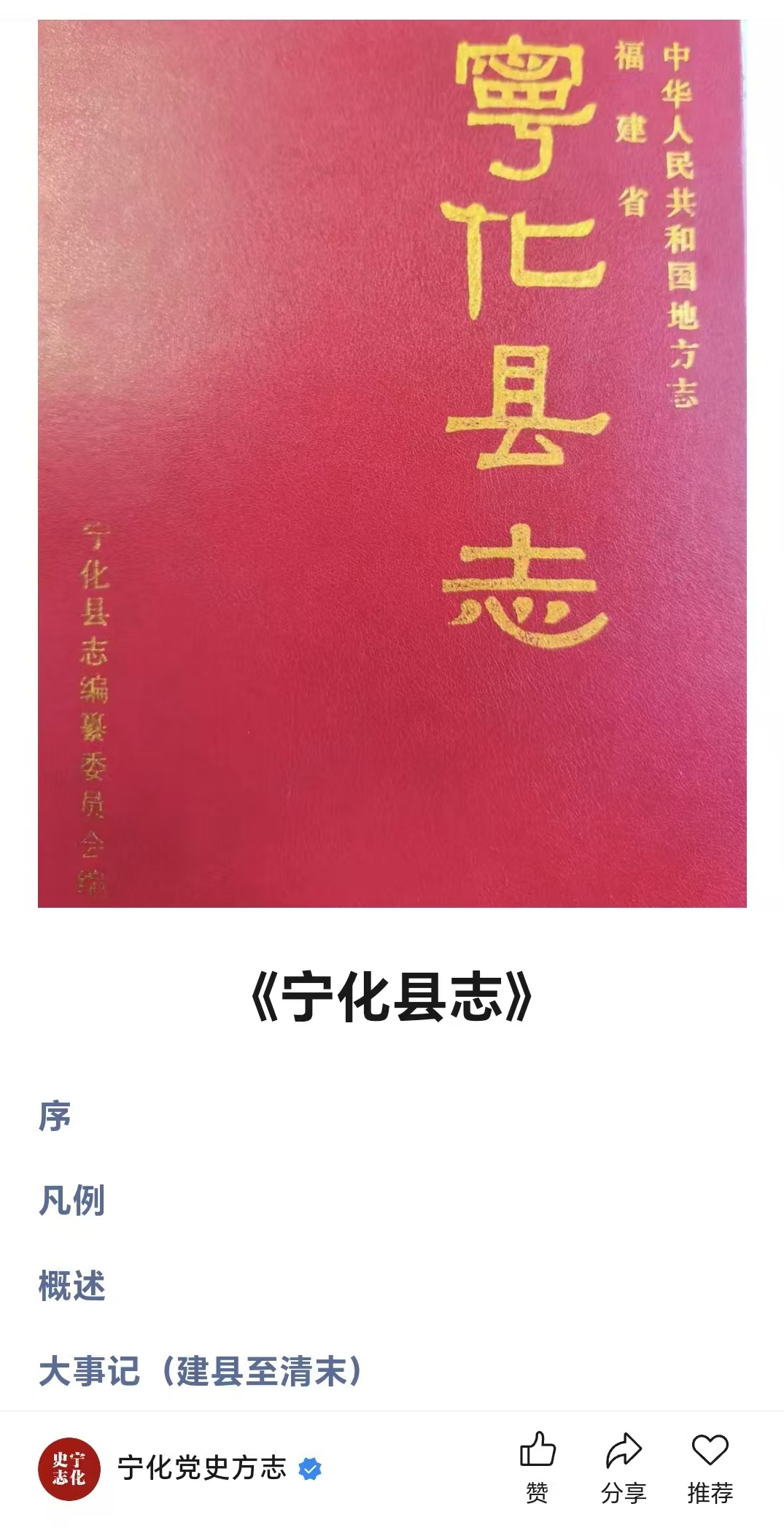 近日,“寧化黨史方志”微信公眾號(hào)對《寧化縣志》(1992版)所有內(nèi)容發(fā)布完畢,并集結(jié)目錄鏈接,方便廣大市民線上查閱。