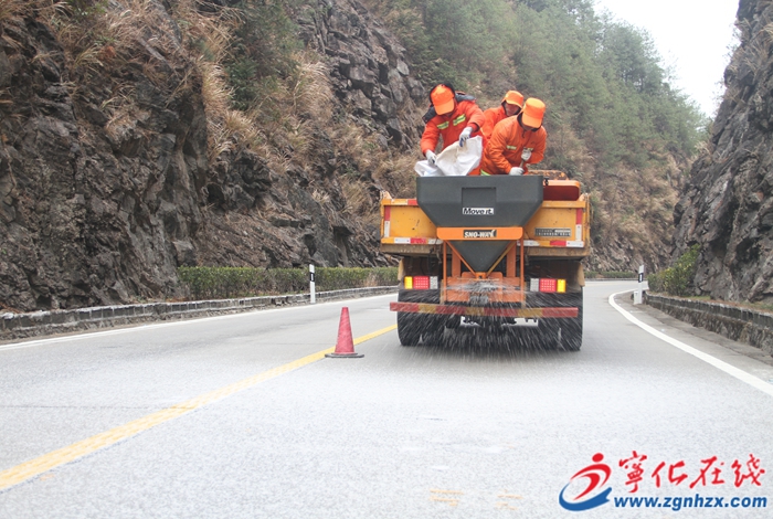 2月7日起,寧化公路分中心組織站班人員對轄區內易結冰路段采用 “機械 + 人工” 的高效作業方式播撒融雪劑,確保道路不積雪、不結冰,為過往車輛提供安全的通行條件。