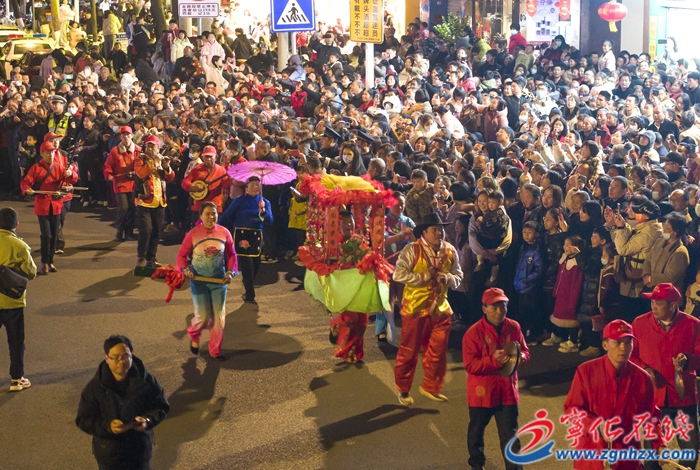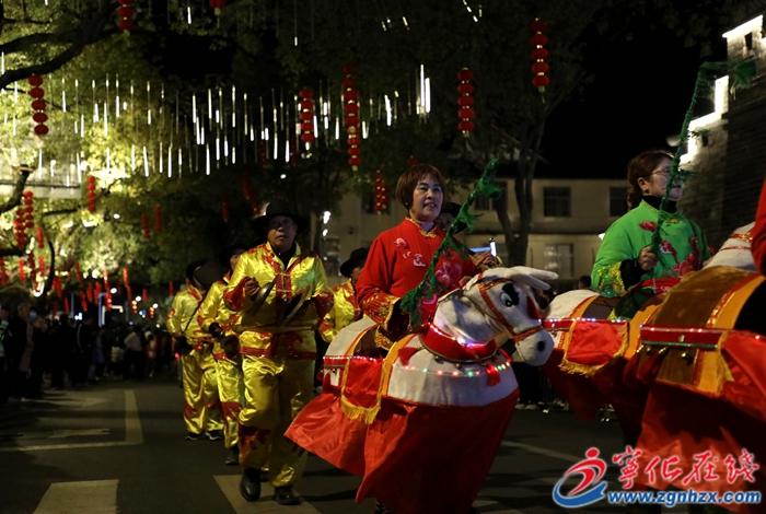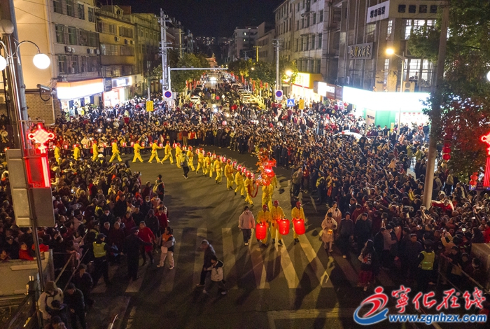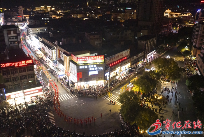 華燈初上,晚上7點30分,各鄉(xiāng)鎮(zhèn)帶來的腰鼓、花燈會、客家夜迎親、客家團牌、石門祁劇、船燈、回回舞、俞家棍、馬燈舞、河蚌舞、舞龍舞獅、牌子鑼鼓等特色非遺項目組成的巡游隊伍由縣政府門口出發(fā),經過壽寧橋、寧陽古街牌坊、南大街、黃慎雕像、新橋、金葉酒店、翠園戲臺,沿城市內環(huán)繞圈巡演,只見現(xiàn)場人潮攢動,巡游隊伍踩著歡快的鼓點,舞動鮮艷的紅綢,載歌載舞,馬路兩旁觀眾圍得水泄不通,人們的心被鑼鼓敲得“沸騰”,被龍燈花燈舞得“火熱”,不停地用手機記錄著精彩瞬間。