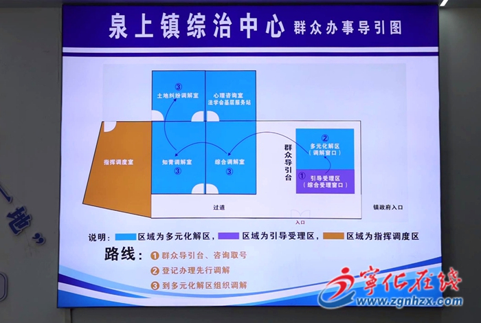 泉上鎮(zhèn)綜治中心整合了司法、公安(派出所)等多部門資源,采用常駐、輪駐等方式集中辦公。中心設(shè)有接待大廳、矛盾糾紛調(diào)解室、心理咨詢室、法學(xué)會基層服務(wù)站、指揮調(diào)度室。