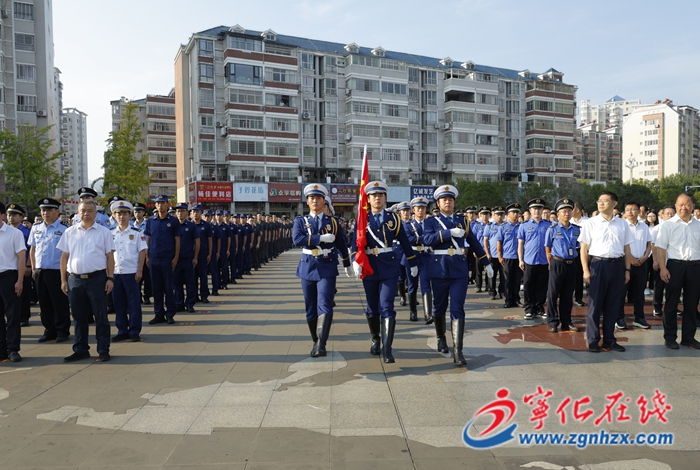 上午8時,升旗儀式開始??h委書記王勝文、縣政協主席張運華等縣副處以上領導干部,以及縣有關單位主要負責同志、駐寧部隊代表、市民群眾近七百人整齊列隊,神情肅穆。國旗護衛隊隊員身著制服,邁著鏗鏘有力的步伐,昂首挺胸護送國旗走向升旗臺。