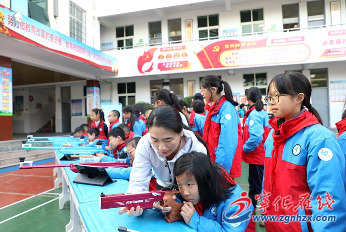在互動環(huán)節(jié)中,射擊世界冠軍、全運(yùn)會冠軍李雪艷分享了自己逐夢賽場的成長故事,現(xiàn)場指導(dǎo)師生體驗光電射擊的樂趣,點燃師生的運(yùn)動熱情。設(shè)置在操場的體育競技區(qū)、射擊體驗區(qū)、客家文化展示區(qū)三大區(qū)域同步開放。學(xué)生積極參加乒乓球托球接力、障礙運(yùn)球、趣味拔河等運(yùn)動,體驗客家剪紙與木活字印刷等非遺文化。