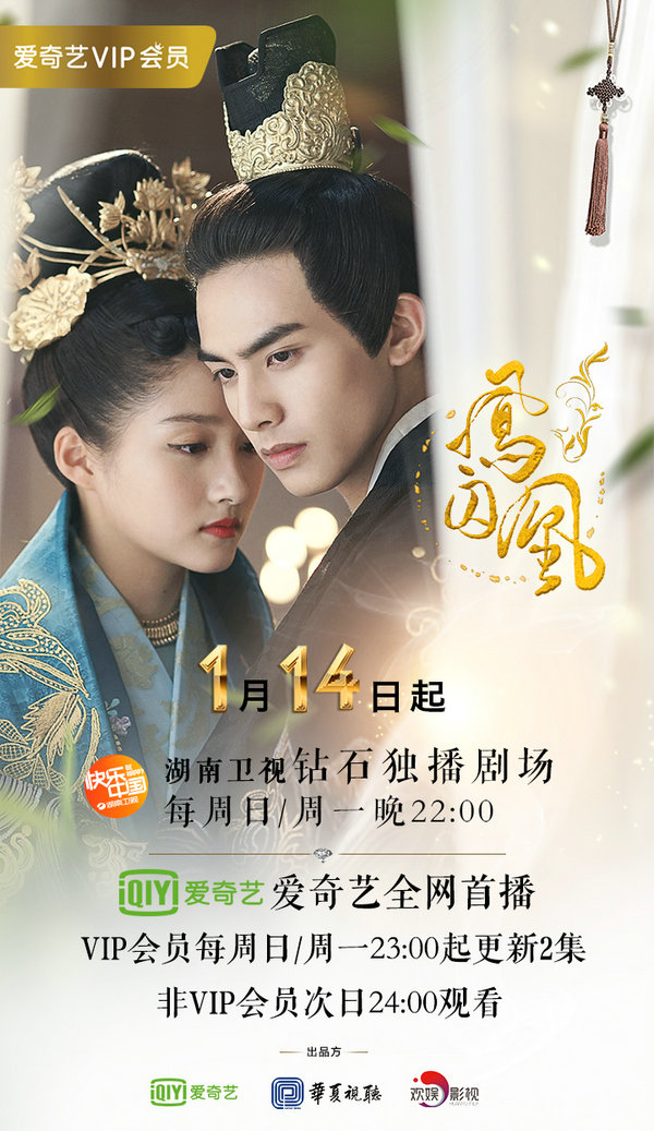 《鳳囚凰》1月14日起,每周日、周一,湖南衛視鉆石獨播劇場晚22:00播出;愛奇藝VIP會員23:00起更新2集,非VIP會員次日24:00觀看,愛奇藝全網首播,敬請期待!