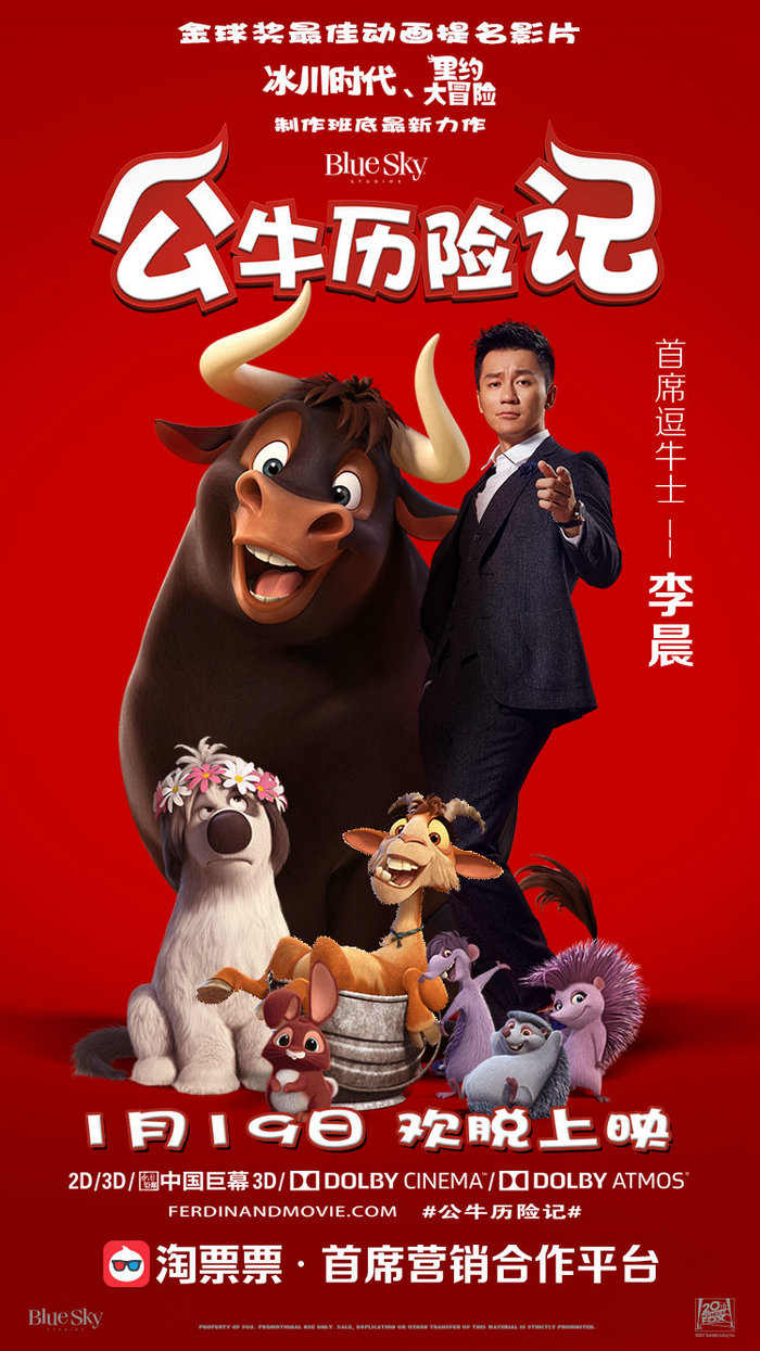 被粉絲愛稱為“大黑牛”的李晨,今日曝光擔任《公牛歷險記》首席“逗牛士”,官方發布了李晨“逗牛士”海報,并玩笑道這頭萌萌壯壯的大公牛簡直是“大黑牛”的西班牙大外甥。影片《公牛歷險記》由打造《冰川時代》系列和《里約大冒險》系列的藍天工作室原班人馬制作,將于2018年1月19日以2D、3D、中國巨幕3D、杜比全景聲、杜比視界制式登陸全國影院與觀眾見面。