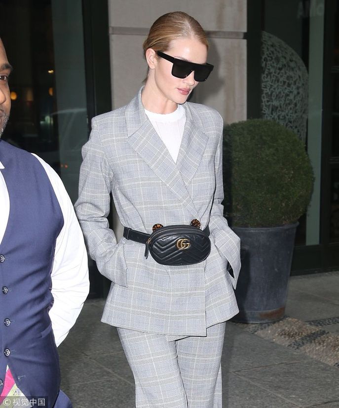 當地時間2018年3月28日,紐約,羅西·漢丁頓-惠特莉(Rosie Huntington-Whiteley)現身街頭,腰系黑色潮包時尚感Max,穿灰系套裝街頭似走秀。