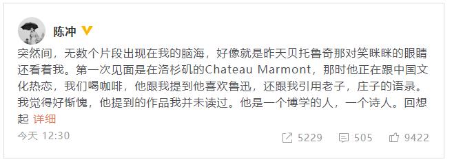 11月27日,陳沖在微博發(fā)文追憶《末代皇帝》導(dǎo)演貝托魯奇:“突然間,無數(shù)個片段出現(xiàn)在我的腦海,好像就是昨天貝托魯奇那對笑瞇瞇的眼睛還看著我。第一次見面是在洛杉磯的Chateau Marmont,那時他正在跟中國文化熱戀,我們喝咖啡,他跟我提到他喜歡魯迅,還跟我引用老子,莊子的語錄。我覺得好慚愧,他提到的作品我并未讀過。他是一個博學(xué)的人,一個詩人。回想起來,《末代皇帝》的制作像是一場八個月的的婚禮,龐大熱鬧而混亂,而我做了八個月的新娘,每天等待著貝托魯奇將蓋頭掀開,又一次愛上我。他愛我們?nèi)齻€:尊龍,鄔君梅和我,這里面沒有性的成分,或者超出性的成分,然而給我的感覺是浪漫的。拍溥儀婉容和文繡在床上做愛的時候,他說:‘我好想鉆進來跟你們一起。’ 然而,他的語氣神態(tài)毫無半點猥瑣。我看的出來他真的好想,就跟一個小孩很想要一盞阿拉丁神燈。”