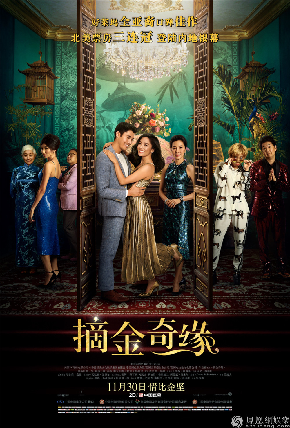 由華納兄弟影片公司出品,康斯坦斯·吳、楊紫瓊、亨利·戈?duì)柖〉妊輪T出演,改編自全球暢銷小說的好萊塢浪漫愛情喜劇《摘金奇緣》(Crazy Rich Asians) 將于11月30日正式在國內(nèi)上映。影片目前在全球已取得超過2.3億美金的票房成績(jī),成為了北美最近10年來票房最高的浪漫愛情喜劇,同時(shí)也是有史以來,票房收入第六高的浪漫愛情喜劇。