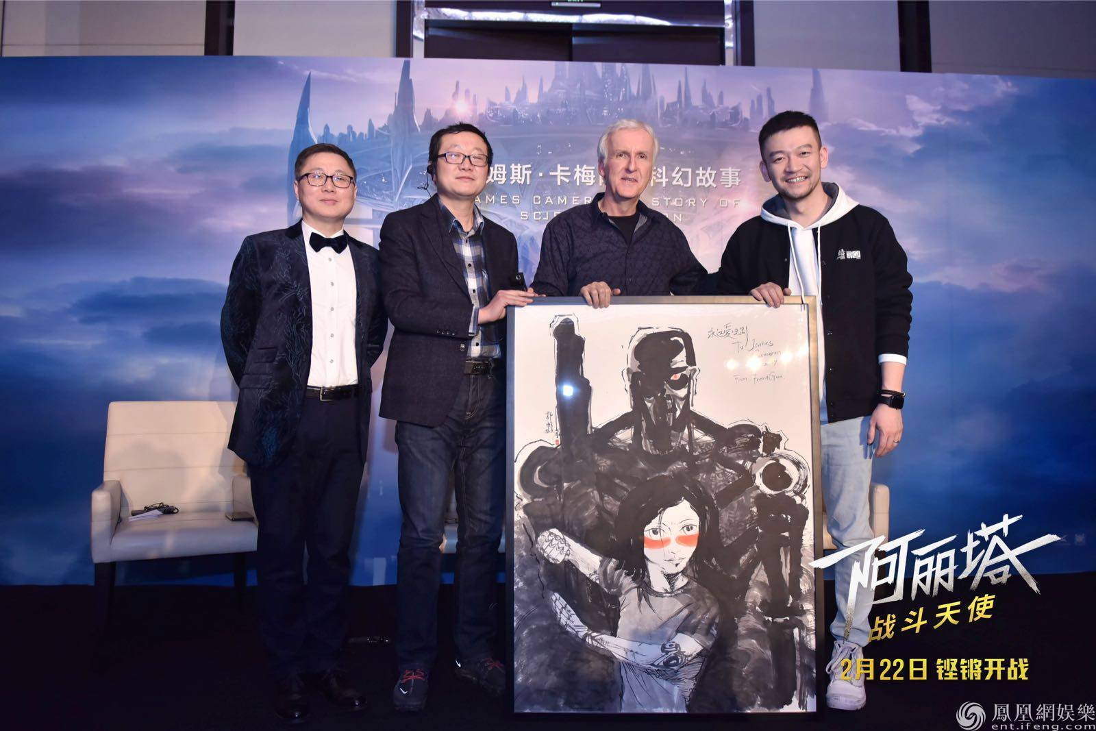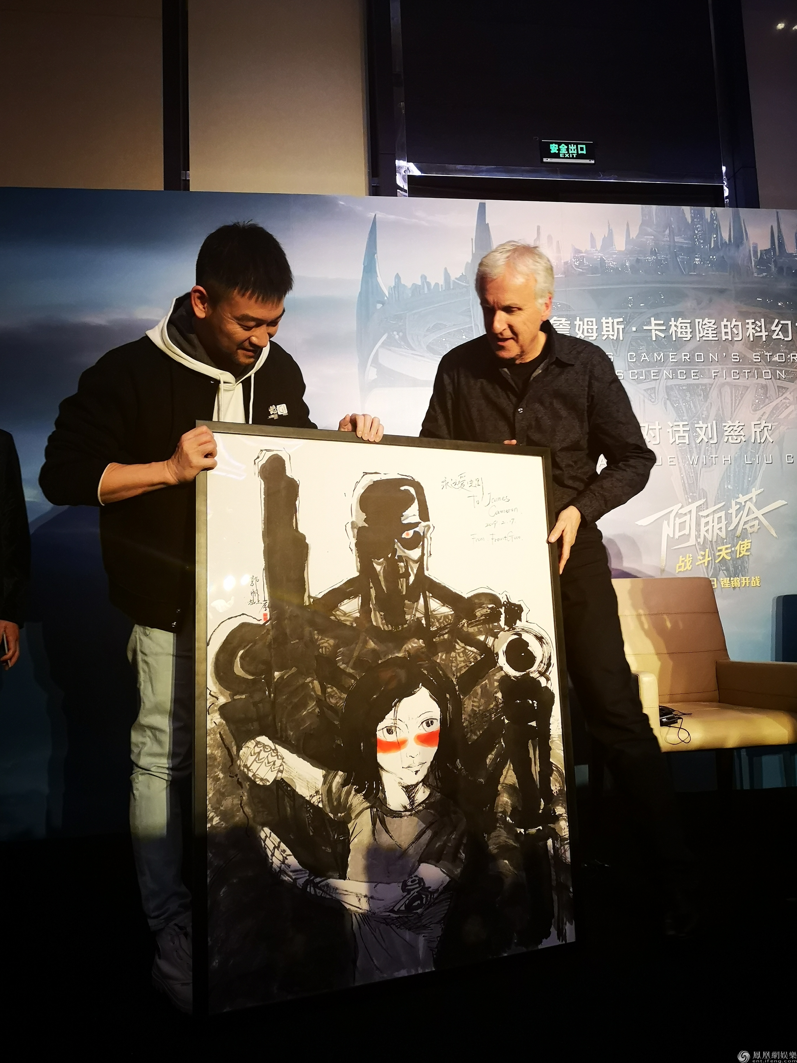 活動最后,電影《流浪地球》導演郭帆則從聽眾轉變為“追星少年”,他帶來一副由自己與藝術家共同創作的水墨畫上臺送給偶像卡梅隆。畫面由卡梅隆電影中的經典角色與中國傳統水墨畫相結合,畫中高大的機器人形象為電影《終結者2》中的經典角色T800,而畫面下方則是《阿麗塔:戰斗天使》中的主人公阿麗塔,畫中一側由郭帆導演親筆題字:永遠愛電影。郭帆導演表示:“卡梅隆導演影響了我的科幻電影觀,感謝他的電影,同時祝福《阿麗塔:戰斗天使》票房大賣。”帶著郭帆導演的祝福,活動完美落幕。