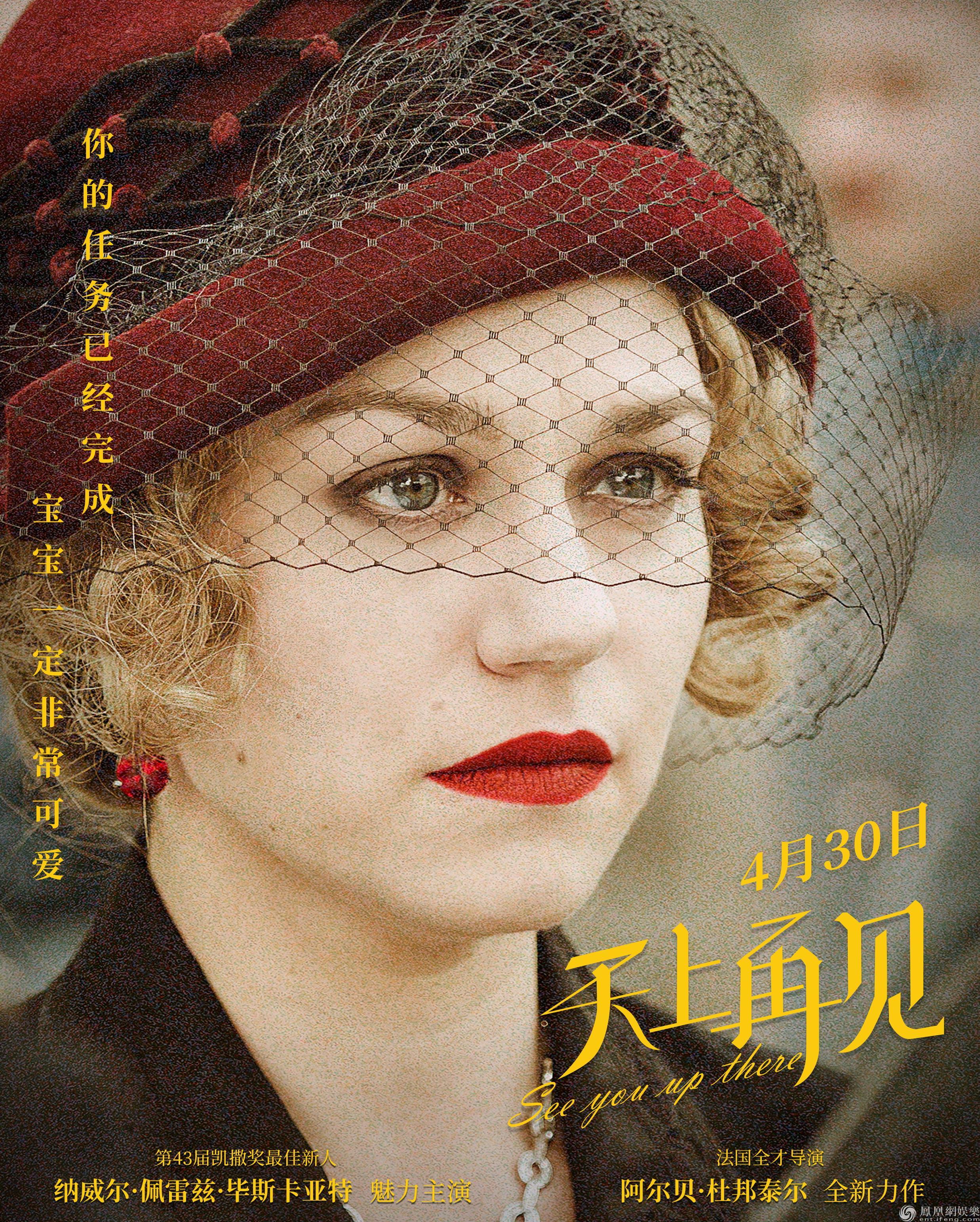 《天上再見》圍繞著出身顯貴且極具藝術(shù)天賦的銀行家之子愛德華(納威爾·佩雷茲·畢斯卡亞特飾)、善良憨厚的會計(jì)艾伯特(阿爾貝·杜邦泰爾飾)、單純善良的小女孩露易絲(埃洛伊茲·巴爾斯特飾)、貌美獨(dú)立的姐姐(艾米莉·徳奎恩飾)、好戰(zhàn)喜功自私自利的長官普拉代爾(羅蘭·拉菲特飾)、專制嚴(yán)厲的父親(尼爾斯·阿賀斯圖普飾)、美麗溫柔的女仆(梅蘭尼·蒂埃里飾)幾人展開,以一戰(zhàn)為背景,以一起震驚法國全國的烈士紀(jì)念碑詐騙案為線索,講述了愛德華和艾伯特?cái)y手向金錢至上、拜金媚俗的欲望世界發(fā)起復(fù)仇的黑色幽默故事。