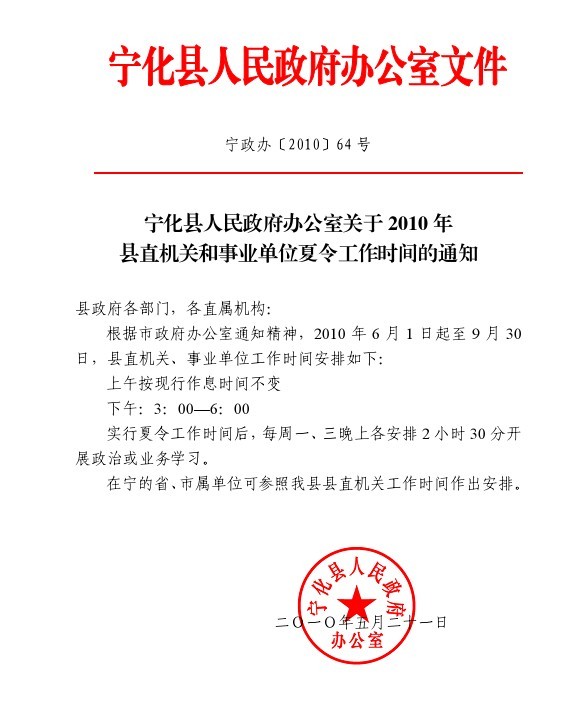 (政辦64號)2010年夏令工作時間通知