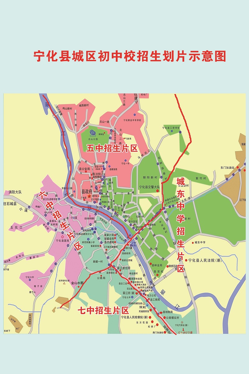 寧化五中 | 城區7校小學畢業生 | 西溪河(至東門橋)以東,松樹園路口(含松樹園小區)——中環十字路口紅綠燈——新橋一路一線以西。 |