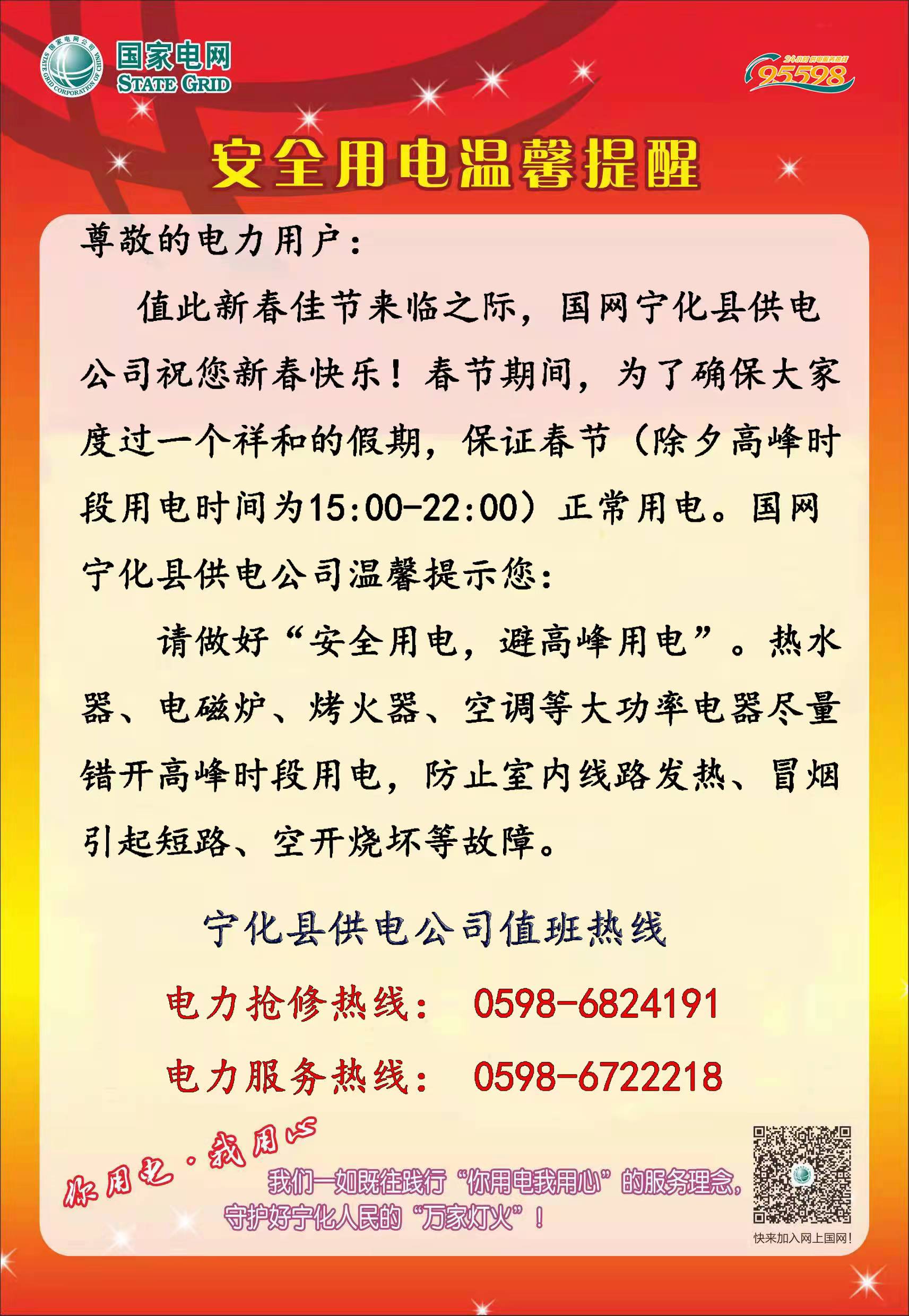 ? ? ? ?在新春佳節即將來臨之際,我們將全力做好春節期間的用電保障和服務工作。如果發生用電故障,請第一時間聯系以下區域電話(6722218),我們將竭誠為您服務!