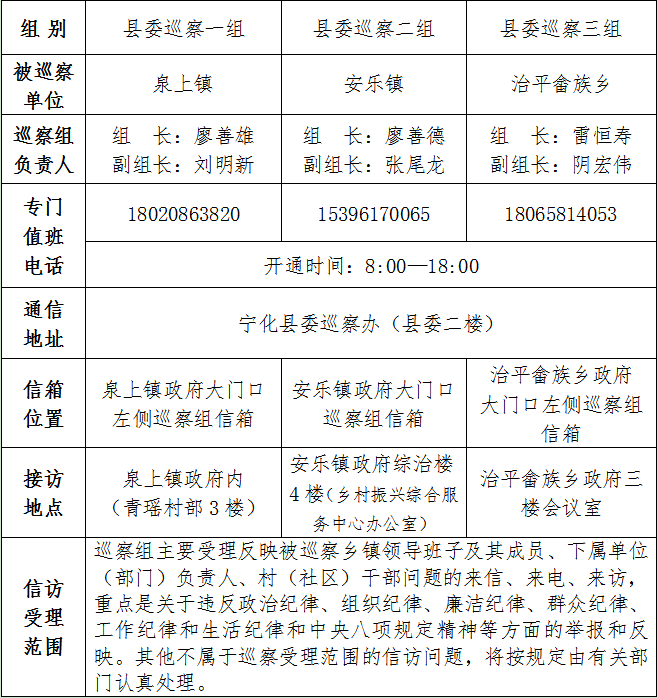 根據縣委巡察工作部署要求,經縣委巡察工作領導小組同意,從11月21日開始,縣委巡察組對泉上鎮、安樂鎮、治平畬族鄉等3個單位開展巡察,巡察時間為40天左右,目前3個巡察組已進駐巡察。