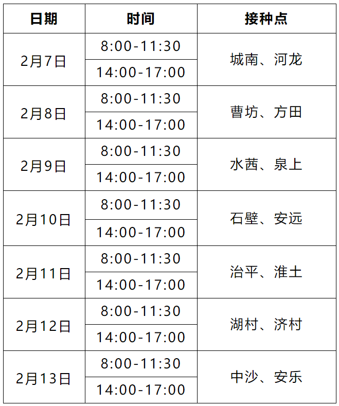 根據市新冠病毒疫苗接種工作總體安排,現將我縣2月7日-2月13日新冠病毒疫苗接種安排如下: