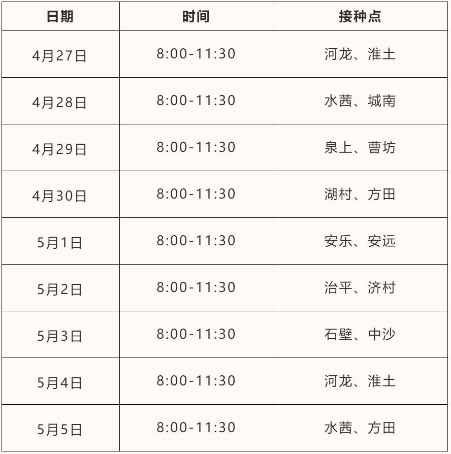 根據(jù)市新冠病毒疫苗接種工作總體安排,現(xiàn)將我縣4月27日-5月5日新冠病毒疫苗接種安排如下: