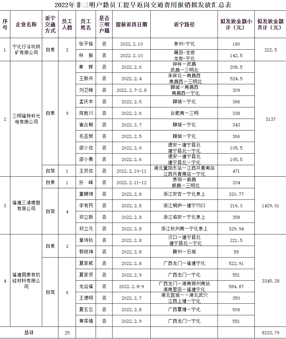 根據(jù)《寧化縣人民政府關(guān)于印發(fā)寧化縣促進(jìn)企業(yè)穩(wěn)崗穩(wěn)工十條措施的通知》(寧政文〔2022〕8號(hào))文件精神,經(jīng)人社局、工信局和財(cái)政局對(duì)企業(yè)申報(bào)材料進(jìn)行審核,確定符合2022年非三明戶籍員工提早返崗交通費(fèi)用企業(yè)4家共計(jì)25人,自乘員工按車票金額報(bào)銷,自駕員工按過路費(fèi)票據(jù)金額報(bào)銷,擬發(fā)放金額8233.79元。詳情見附件。現(xiàn)將有關(guān)信息進(jìn)行公示。