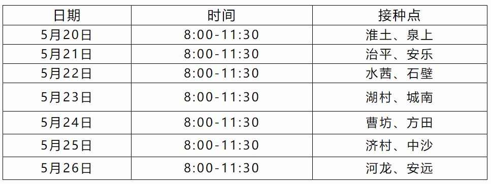 根據(jù)市新冠病毒疫苗接種工作總體安排,現(xiàn)將我縣5月20日-5月26日新冠病毒疫苗接種安排如下: