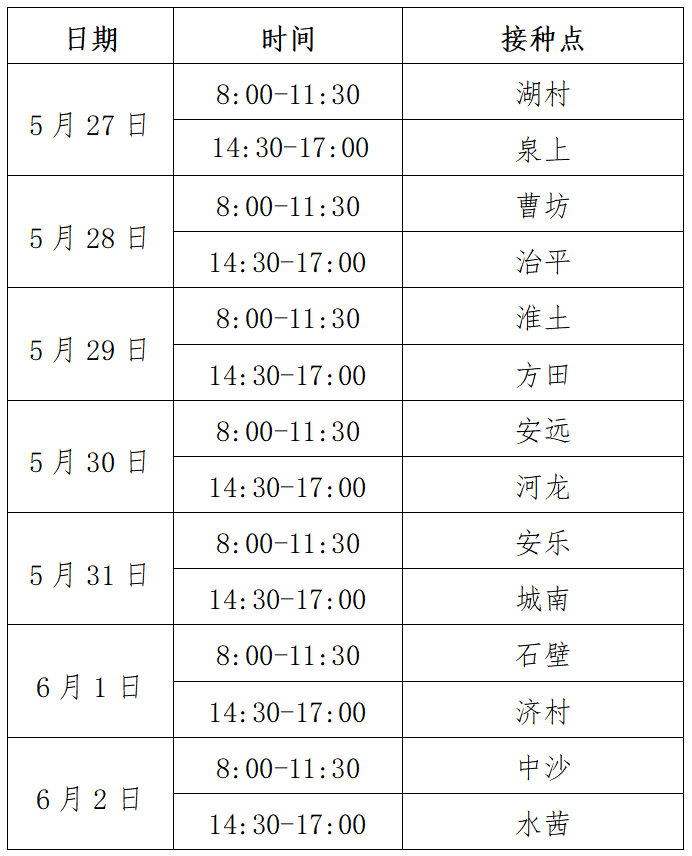 根據(jù)市新冠病毒疫苗接種工作總體安排,現(xiàn)將我縣5月27日-6月2日新冠病毒疫苗接種安排如下: