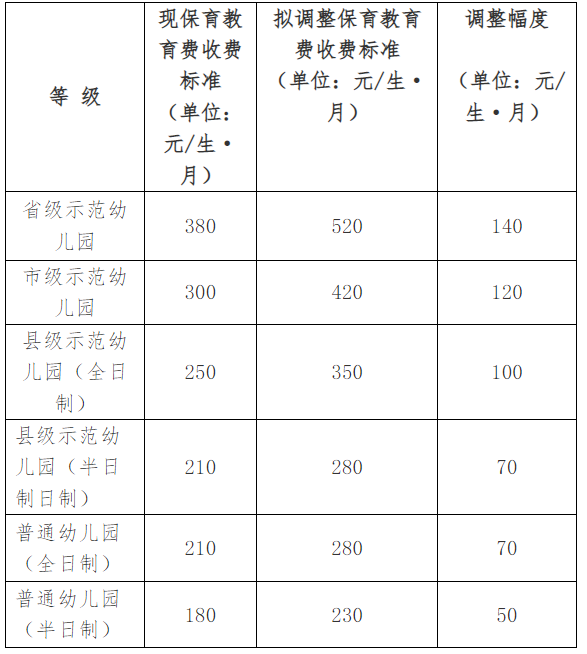 寧化縣公辦幼兒園保育教育費收費標準調整方案(征求意見稿)