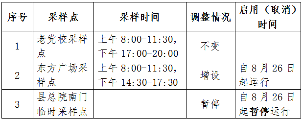 根據當前疫情防控形勢,為方便廣大群眾核酸檢測需求,經研究,決定自8月26日起增設東方廣場核酸采樣點,暫??h總院南門臨時核酸采樣點。黃碼人員請前往老黨校核酸采樣點的黃碼通道進行核酸采樣。