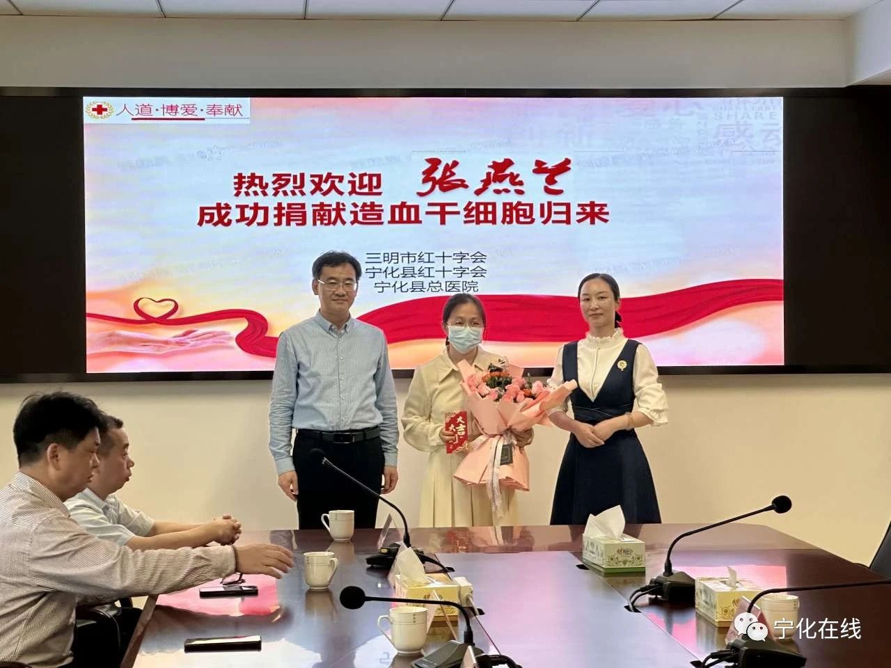 4月23日,寧化縣總醫(yī)院舉行歡迎儀式,歡迎張燕蘭成功捐獻(xiàn)造血干細(xì)胞歸來(lái),并向張燕蘭獻(xiàn)花,對(duì)她的奉獻(xiàn)精神給予充分肯定。據(jù)了解,張燕蘭在福建省腫瘤醫(yī)院進(jìn)行造血干細(xì)胞采集并成功捐獻(xiàn),成為三明市第26例、寧化縣第5例造血干細(xì)胞捐獻(xiàn)者。