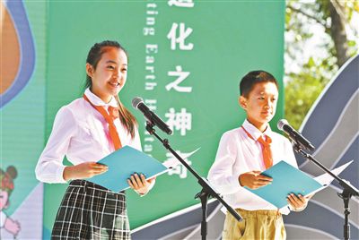 延慶世界地質公園的小志愿者誦讀了設立“地質公園日”的綠色倡議書攝影/本報記者 魏彤