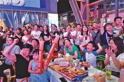 中秋假期,五棵松因為籃球世界杯成為“夜京城”最熱鬧的地方之一??粗笃聊槐荣愞D播,喝著啤酒,成了不少消費者“刷夜”的方式。新京報記者 吳寧 攝