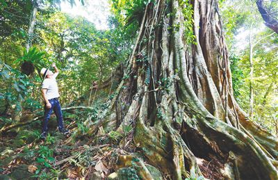 還未深入百花嶺景區(qū),采訪團(tuán)成員便感受到了熱帶雨林的神秘與魅力:景區(qū)大門處,屹立著一棵樹齡逾百年的高山榕樹,樹高30米,樹冠碩大,樹幅面積達(dá)200余平方米,不斷衍生的榕須從樹上垂下,互相纏繞,最后落進(jìn)土里,一樹成林,不時有松鼠從枝干間快速閃過,發(fā)出梭梭的聲響,可循聲覓去,它卻已不見蹤影。